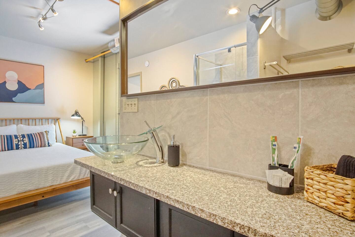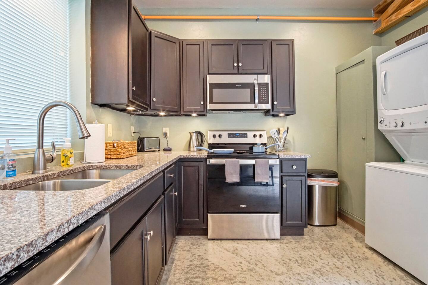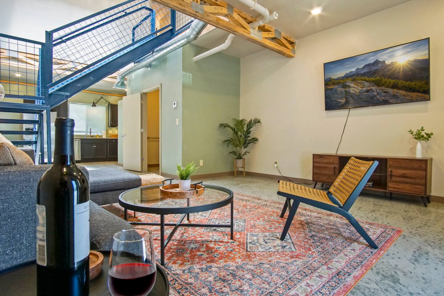 Whether you are just getting away for the weekend or looking for an extended stay, we’re committed to offering comfortable, clean and exciting experiences for our guests. We offer contact-free check-in and 24/7 support which limits in-person interaction. This property has exterior cameras for guests safety and for the protection of the property. Amenities include: - High speed internet - Free parking - Complimentary stocked coffee bar and snacks - Two private balconies - Games - In-unit washer and dryer - Fully furnished kitchen with brand new appliances. ★ NO PETS ALLOWED ★ We love those little (and not so little) furry bundles of joy. Sadly, our loft is not suitable to accommodate them. ★ NO SMOKING INSIDE ★ Please refrain from smoking inside the cabin! Any smoking evidence will result in odor removal and furniture cleaning fees. ★ NO PARTIES/EVENTS ★ We kindly ask you to treat our place as your own to preserve its pristine condition for future guests and your return visits. Please respect the community noise ordinance from 10 PM to 10 AM. Unauthorized gatherings will be terminated immediately with no refund. Always be respectful of our community and be good neighbors. What To Bring: - Favorite coffee and creamers - Food/ Snacks - Condiments - Oils, seasonings, and cooking basics - Ice - Personal Toiletries Housekeeping provides a starter supply of basic essentials. These supplies will not be replenished. Below is a list of the items: - 1-2 rolls of toilet paper, per bathroom - 1 bottle of hand soap, per bathroom - 2 bathroom garbage bags, per bathroom - 1 bottle of shampoo, conditioner, and body wash, per shower - 1 roll of paper towels - 1 bottle of dish soap - 2 sponges - 4 dishwasher pods - 4 tall kitchen garbage bags - 5 coffee pods - Small powder creamer - Small sugar - Salt/ pepper - 4 Laundry pods WiFi terms and conditions: WiFi is provided as a convenience only and is not integral to the use the property. No refund of payments shall be given for outages, content, lack of content, speed, access problems.